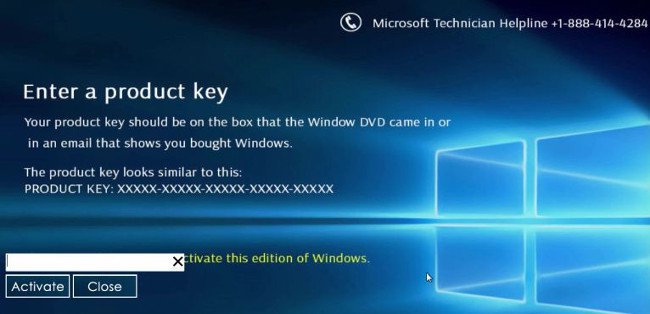 Nếu máy tính của bạn bị khóa và trên màn hình hiển thị thông báo “Activate this edition of Windows”. Cùng với đó là yêu cầu bạn gọi đến trung tâm hỗ trợ để khắc phục vấn đề trên. Chắc chắn máy tính của bạn đã bị phần mềm độc hại Rogue.Tech-Support tấn công.