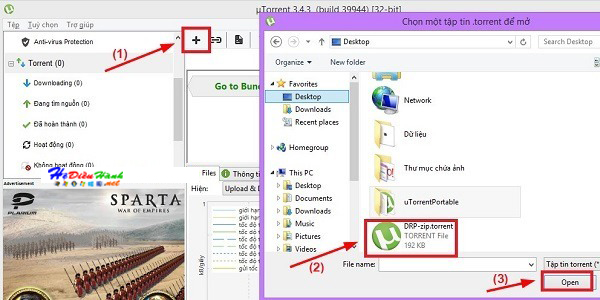 Đầu tiên bạn nhấp vào biểu tượng dấu cộng + => sau đó tìm đến file Torrent bạn đã tải về và nhấn Open để mở.