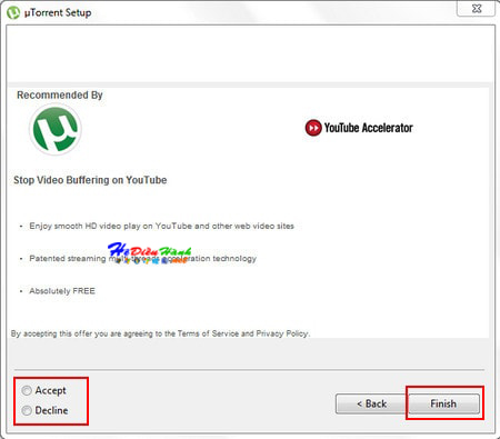 Bước 7: Chọn Accept để đồng ý các điều khoản tiếp theo hoặc Decline nếu không đồng ý. Chọn Finish để kết thúc quá trình cài uTorrent.