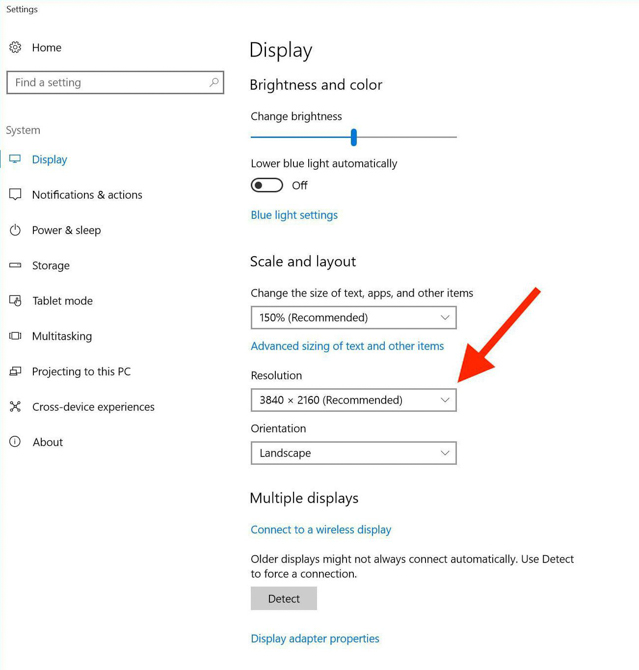 Việc điều chỉnh độ phân giải trong Windows 10 khá phức tạp. Đầu tiên bạn phải bấm chuột phải ở màn hình desktop, chọn Display Settings, sau đó kéo xuống dưới và chọn mục Advanced display settings để có thể chỉnh độ phân giải.