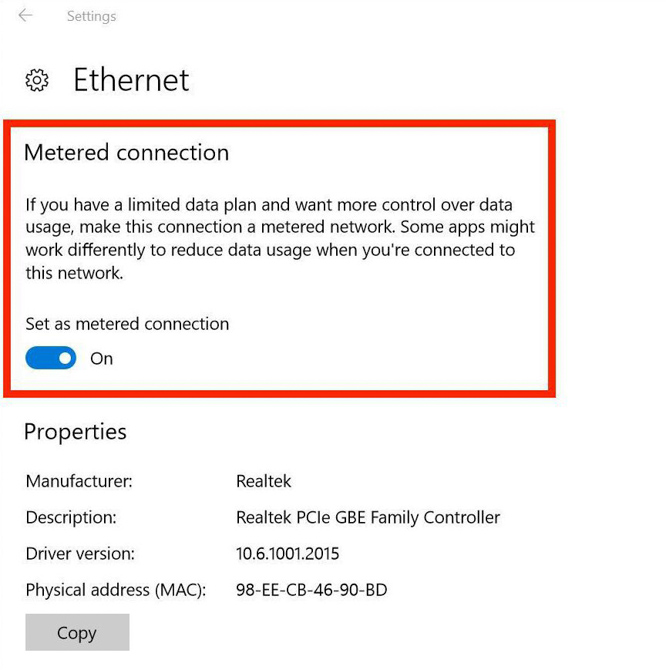 Bản cập nhật mới cho phép cài đặt mức trần dung lượng cho cả kết nối có dây (Ethernet). Bạn có thể tìm thấy tùy chọn Set as metered connection trong mục Settings/Network & Internet/Ethernet.