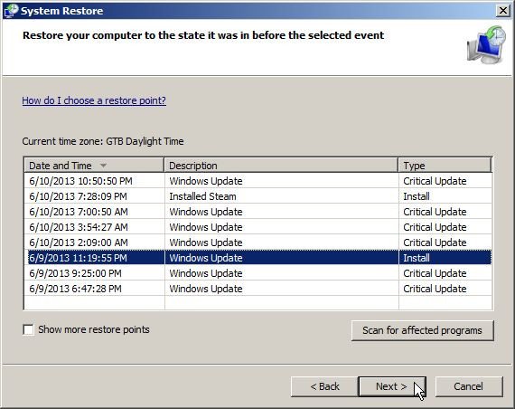 4. System Restore sẽ mở và hiển thị trên màn hình một danh sách các điểm hồi phục (restore points). Thử sử dụng một điểm khôi phục được tại trước khi virus khóa màn hình FBI MoneyPak tấn công máy tính của bạn.