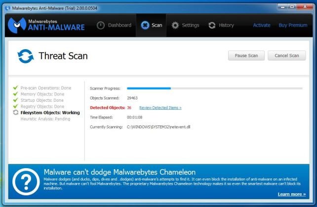 6. Malwarebytes Anti-Malware sẽ bắt đầu quét hệ thống của bạn để tìm và loại bỏ các phần mềm độc hại.